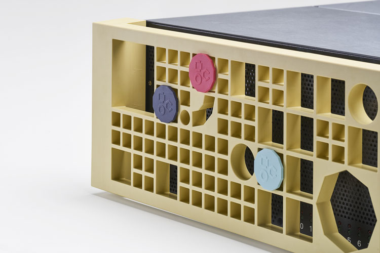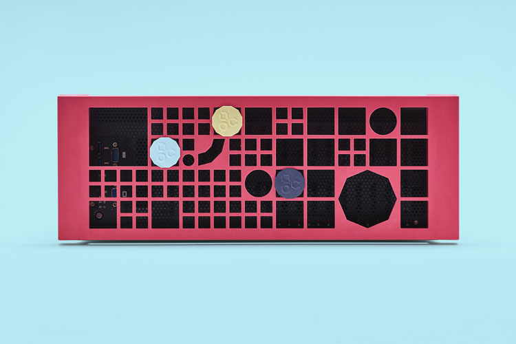 Following the brand’s colour palette of light and dark blue, a pale yellow and a soft red, the patterned airflow grid can be customised further by attaching clip on shapes.