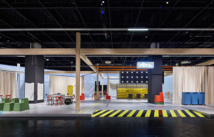 Enveloped in a reflective horizon made from a hanging fabric, the design of the overall space includes a lobby, a café, and a variety of different areas for people to work, recognising that the fair itself “was a workspace”.